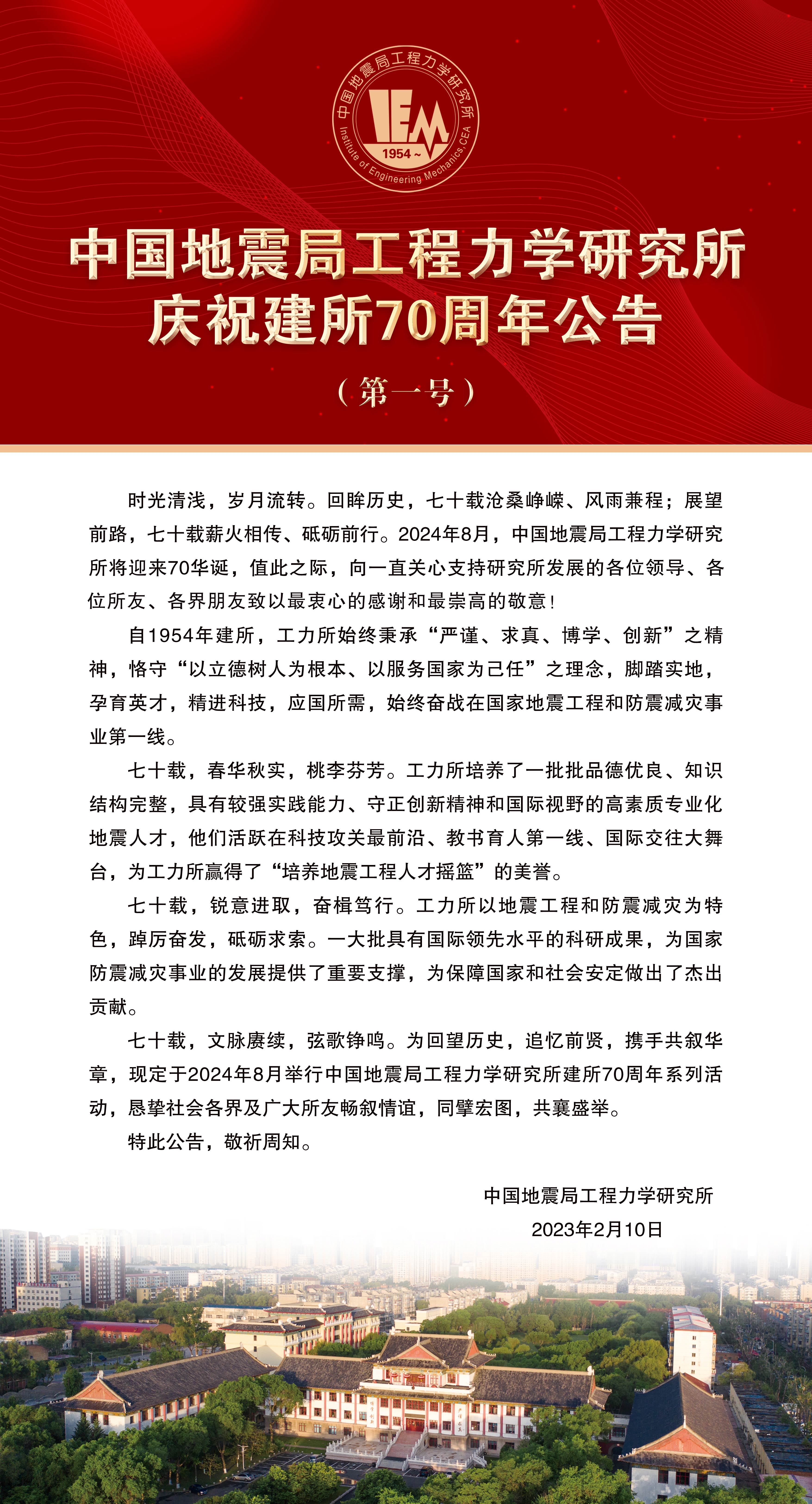 中國地震局工程力學研究所慶祝建所70周年公告(第一號)