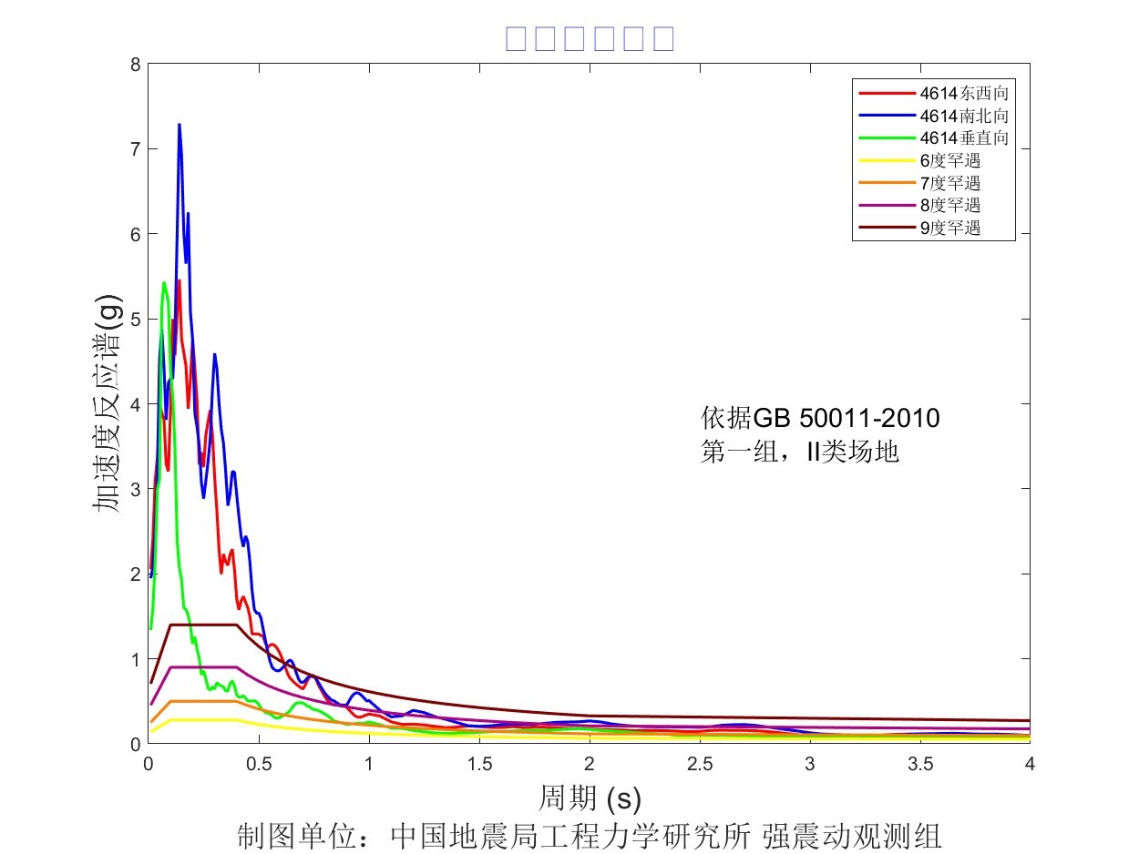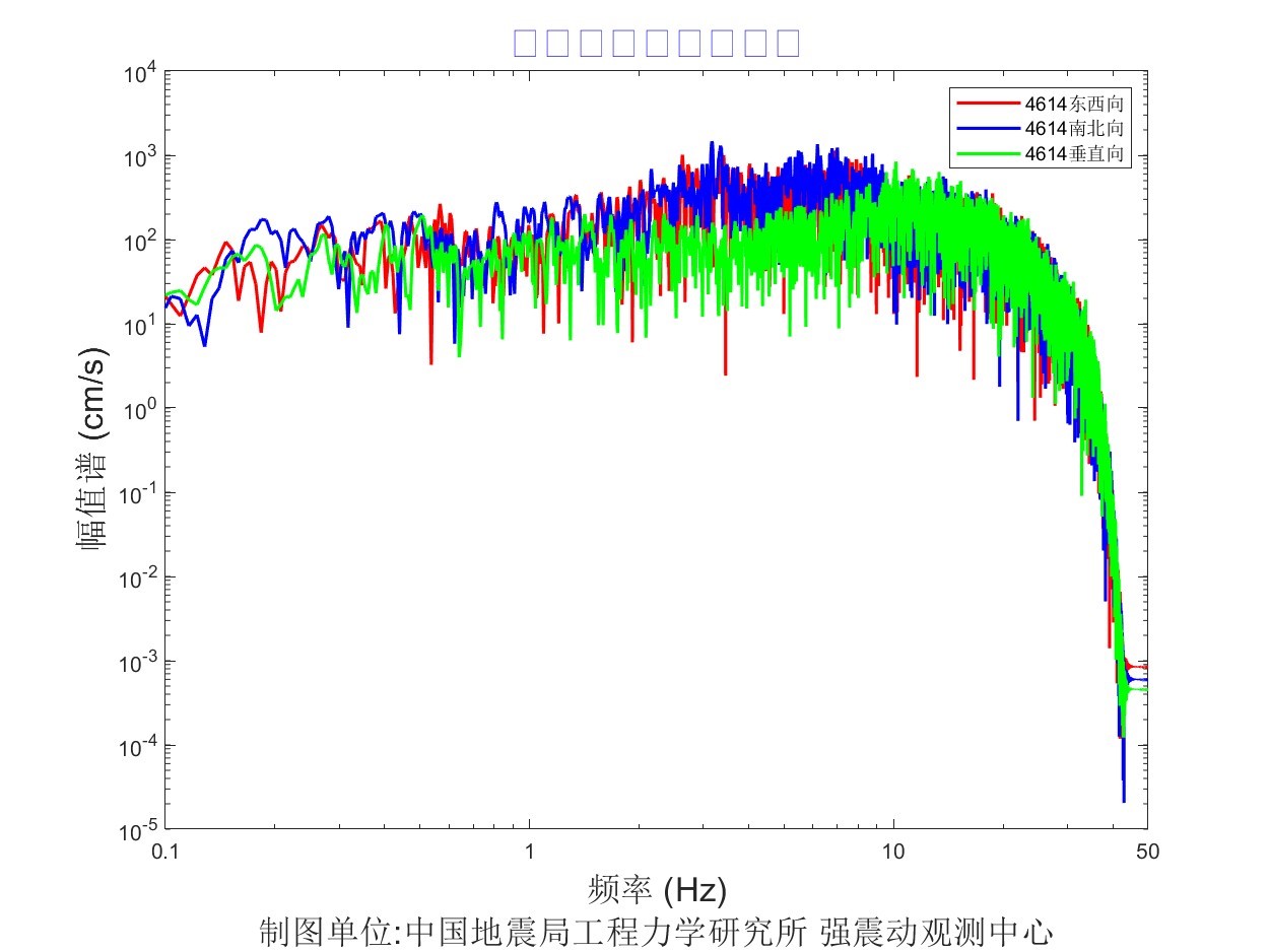 儀器地震烈度分布圖見圖1,地震峰值加速度分布圖見圖2,地震峰值速度分布圖見圖3,地震加速度反應譜(T=0.3s、T=1.0s、T=3.0s)分布圖見圖4、圖5、圖6。4614臺強震動記錄見圖7,4614臺加速度反應譜見圖8,4614臺傅里葉幅值譜見圖9。