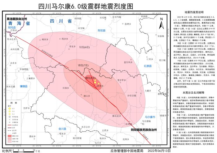 發布時間: 2022-06-22 點擊數量:69082022年6月10日,四川阿壩州馬爾康市先后發生5.8、6.0、5.2級地震,屬震群型地震。地震發生后,按照應急管理部部署,中國地震局組織四川省地震局開展應急處置工作,依照《地震現場工作 第3部分:調查規范》(GB/T 18208.3-2011)、《中國地震烈度表》(GB/T 17742-2020),通過災區震害調查,并綜合應用儀器烈度、地震構造背景、余震分布、震源機制、遙感影像等科技支撐成果,確定了此次地震的烈度分布,并依照《地震烈度圖制圖規范》(GB/T 38226-2019)編制完成《四川馬爾康6.0級震群地震烈度圖》。