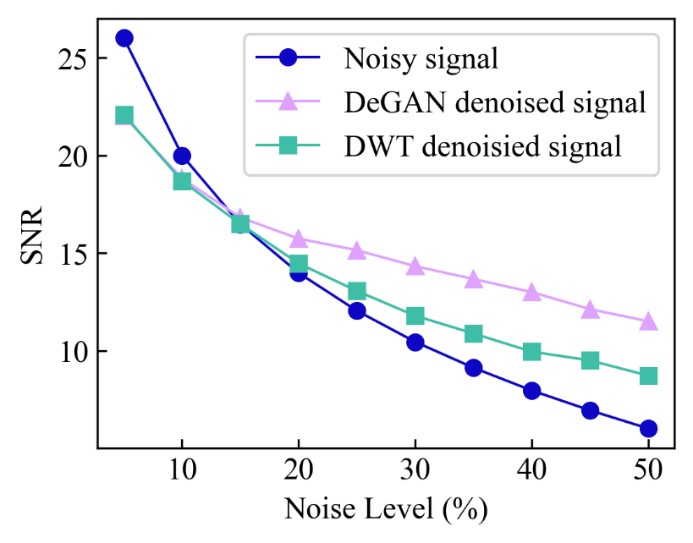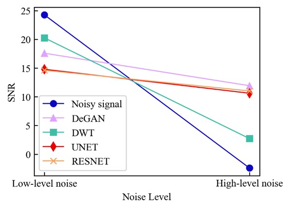 在時域和時頻域上比較了 DeGAN 和基于 DWT 的方法、基于 U-NET 的方法和基于 ResNet 的方法對模擬噪聲和真實噪聲的去噪性能。結果表明,DeGAN可以有效去除強噪聲數據中的噪聲的同時,還可保留有用的振動信號。在經過DeGAN 去噪處理后,信號的 SNR 從-2.39提高到11.92。