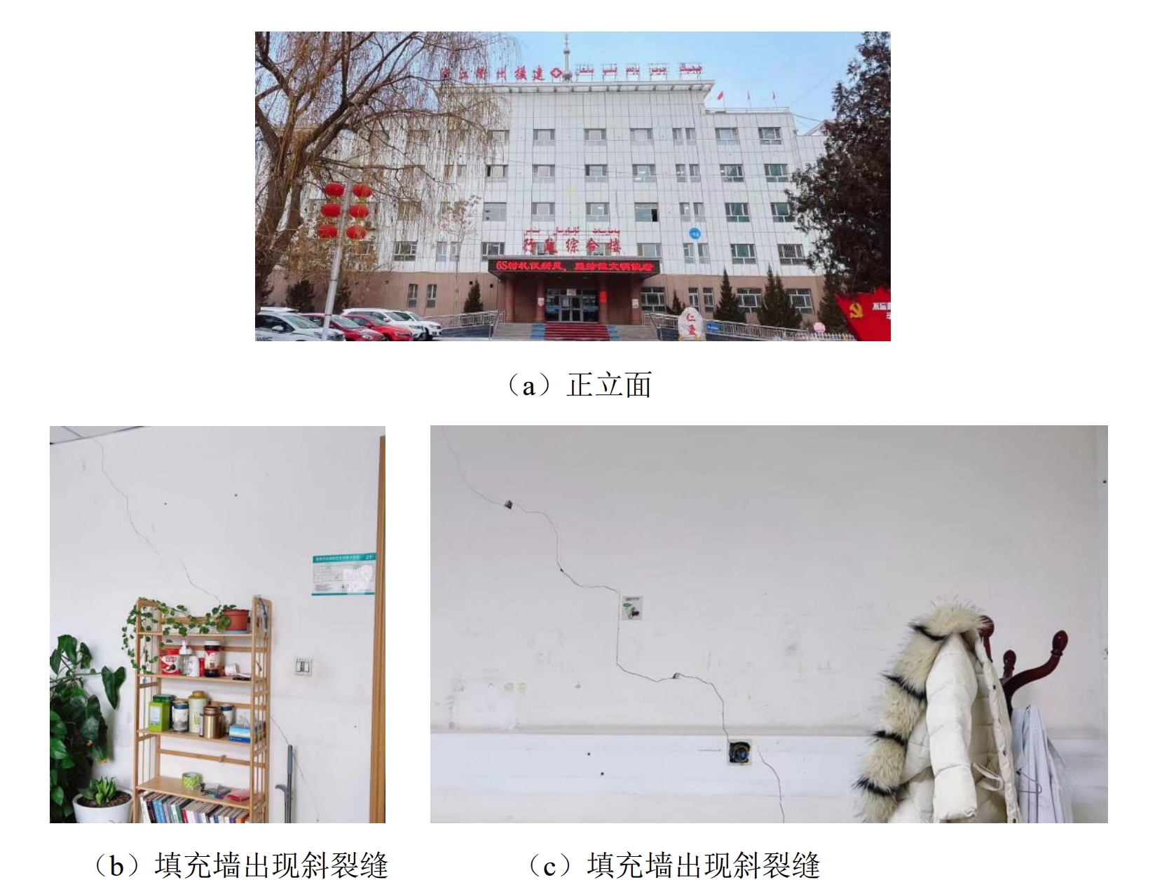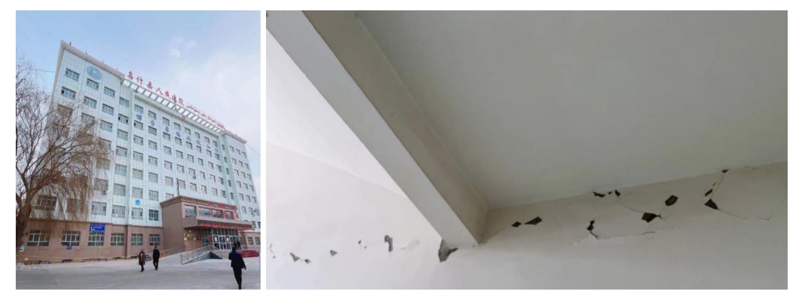 科考隊主要考察了Ⅶ度(7度)區內具有抗震設防的醫院、衛生院等建筑,主要包括框架結構、框架-剪力墻結構、消能減震結構以及早年建造的砌體結構。通過調查發現,框架結構的梁柱構件基本完好,部分填充墻與框架梁之間因變形不協調出現輕微裂縫,少數填充墻出現交叉斜裂縫;消能減震結構基本完好,阻尼器上、下剪力墻錯動導致剪力墻兩側填充墻抹灰層開裂。