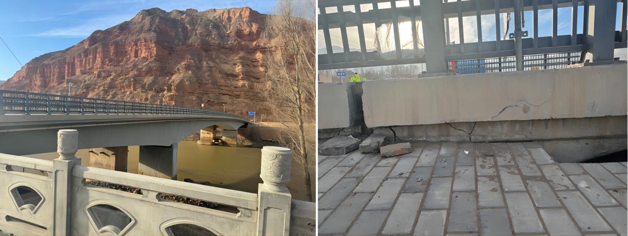 調查簡述:大河家黃河大橋舊橋為鋼構橋,橋梁主體橋墩、梁未發現明顯裂縫,在兩端橋臺發生嚴重破壞,梁端擋快由于碰撞發生沿擋快的斜裂縫;橋面局部護欄發生較大尺寸外閃;大河家黃河大橋新橋為連續梁橋,橋梁主體橋墩未發現明顯裂縫,梁體在甘肅側橋臺處發生碰撞,局部梁體產生可見裂縫,伸縮縫處縫隙加大,且向青海側滑移3cm左右;橋梁青海一側橋臺發生嚴重裂縫,裂縫寬度5cm左右。梁體有逆時針轉動傾向。在大河家黃河大橋旁邊的廣場有一個簡支梁公路橋,該橋主體完好,在橋臺處欄桿有外閃,以及橋面與路面的撞擊裂縫。