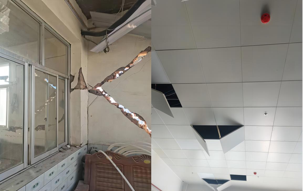 1.調查大河家中學教學樓、實驗樓、食堂和學生宿舍的震害情況。其中,4個結構的結構構件均無明顯破壞,非結構構件砌體填充墻、吊頂破壞嚴重。雖無倒塌風險,但使建筑的使用功能中斷。