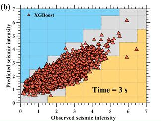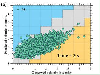 圖1 3秒時間窗下的預測值和觀測到的地震烈度的比較,時間表示時間窗的大小。灰色區域是正確的預測值,藍色區域是高估的預測值,黃色區域是低估的預測值。綠點表示(a)Pd模型,紅三角表示(b)xgBoost模型。