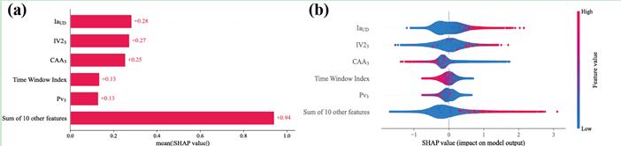圖3 (a)基于SHAP值的參數的全局重要性排名。(b) 不同參數的SHAP匯總圖,數據點的顏色從藍色(低)到紅色(高)過渡代表參數的低值到高值。