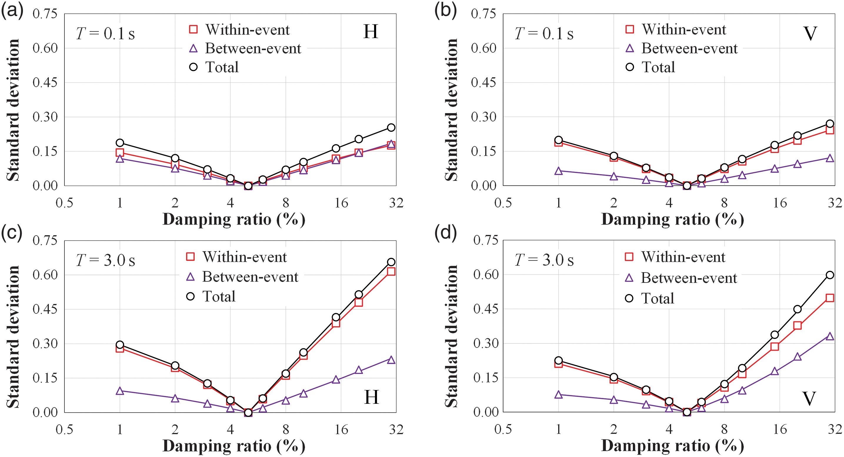 (4)阻尼比為1%時的所有標(biāo)準(zhǔn)差都小于阻尼比為30%時的標(biāo)準(zhǔn)差。總標(biāo)準(zhǔn)差與事件內(nèi)標(biāo)準(zhǔn)差接近,表明DMF模型的不確定性主要取決于震源效應(yīng)以外的效應(yīng)。豎向DMF的標(biāo)準(zhǔn)差略小于水平向DMF的標(biāo)準(zhǔn)差。