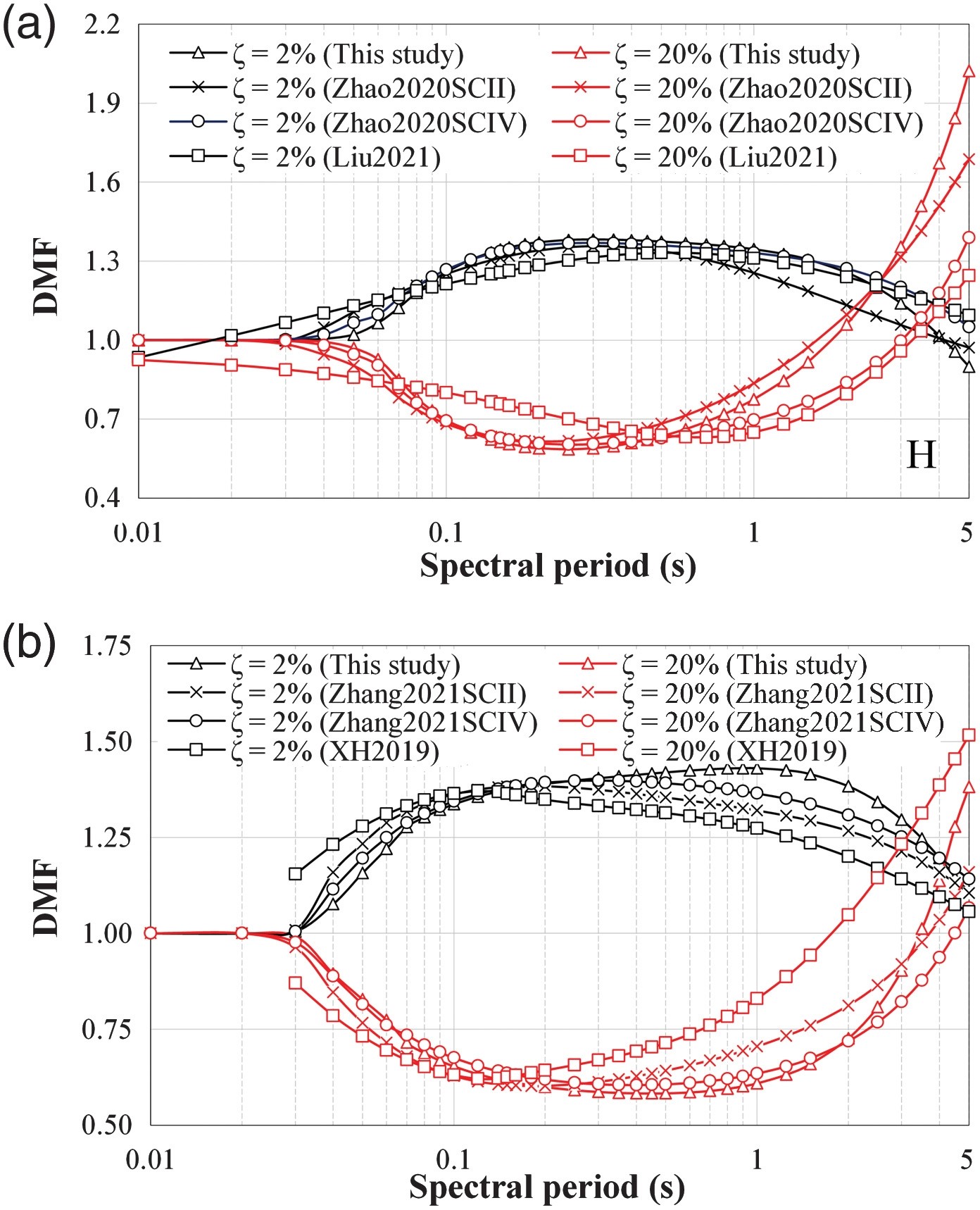 (1)海域和陸域地震動的DMF在大多數(shù)譜周期內(nèi),海域和陸域地震動的DMF差異顯著,場地條件對海域DMF的影響很小。在較短的周期內(nèi),海域模型小于陸上模型;水平分量的海域模型在長周期高阻尼比時比陸域模型大。