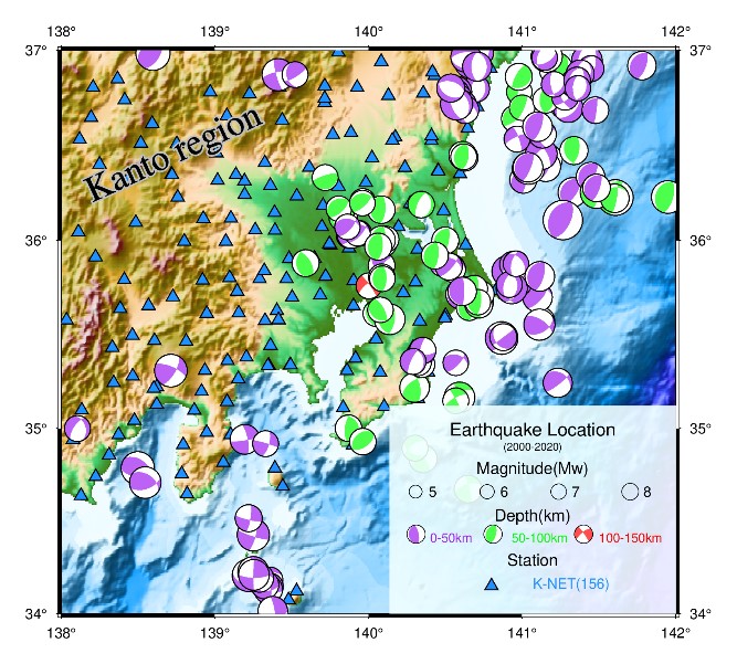 圖1 所選K-NET強(qiáng)震臺(tái)站和地震震源分布