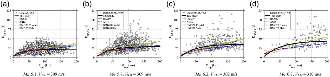 發(fā)布時(shí)間: 2023-04-11 點(diǎn)擊數(shù)量:103043)當(dāng)斷層距大于100 km時(shí),持時(shí)的SVR-GMMs預(yù)測(cè)結(jié)果小于BMG20(圖4)。當(dāng)M<5.5時(shí),顯著持時(shí)隨距離衰減存在明顯的遠(yuǎn)場(chǎng)飽和現(xiàn)象,顯著持時(shí)的飽和距離為100 km。本文開(kāi)發(fā)的SVR-GMMs有效地捕捉到了顯著持時(shí)存在的這一區(qū)域衰減特征。
