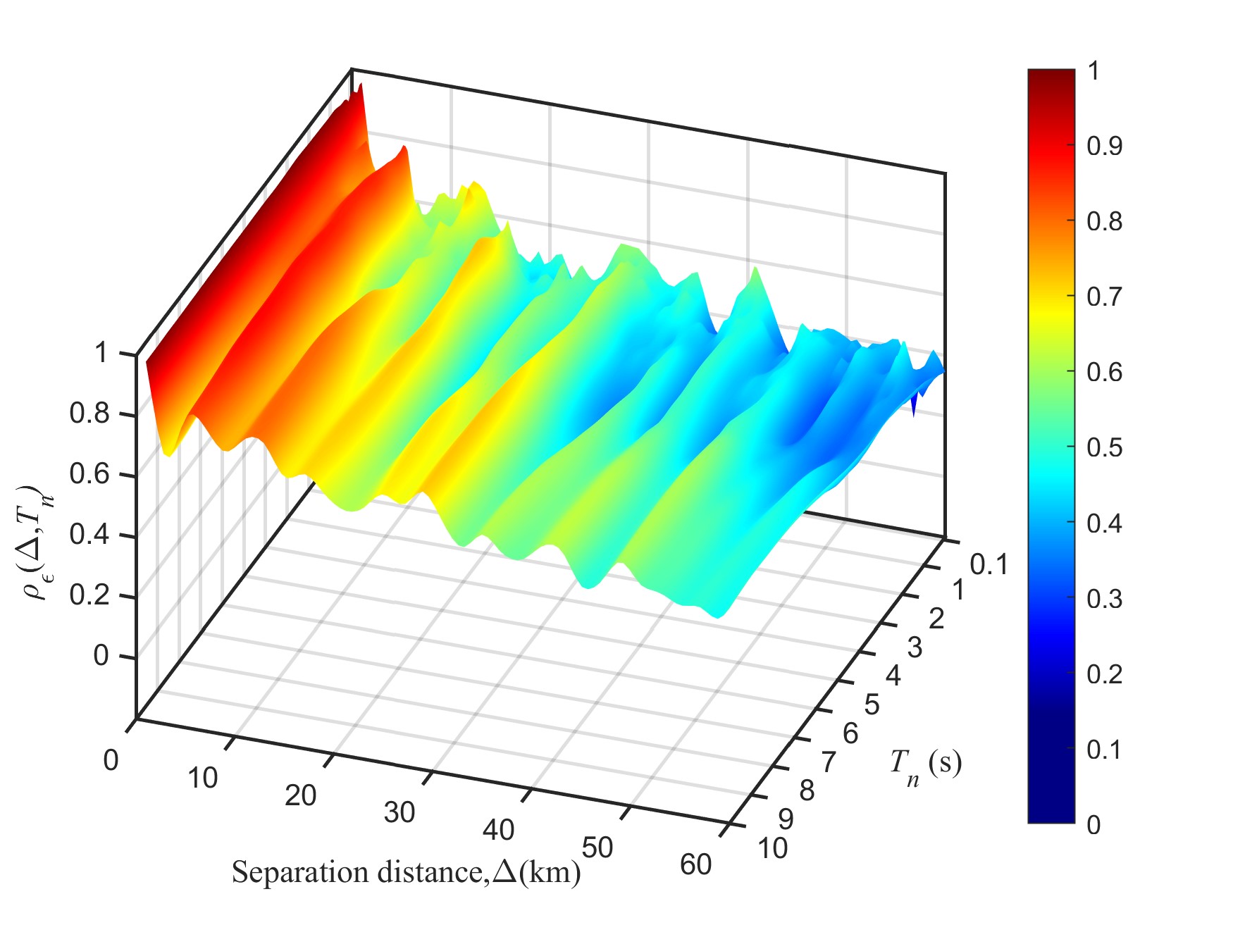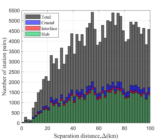 2.用半變異函數方法計算的空間相關性值,當分離距離達到100 km時,空間相關系數接近于零;用插值方法給出了空間相關性系數隨分離距離和不同周期的分布關系,發現隨著臺站之間距離的增加,事件內空間相關性迅速衰減;隨著周期的增加,空間相關性也增加(圖2)。