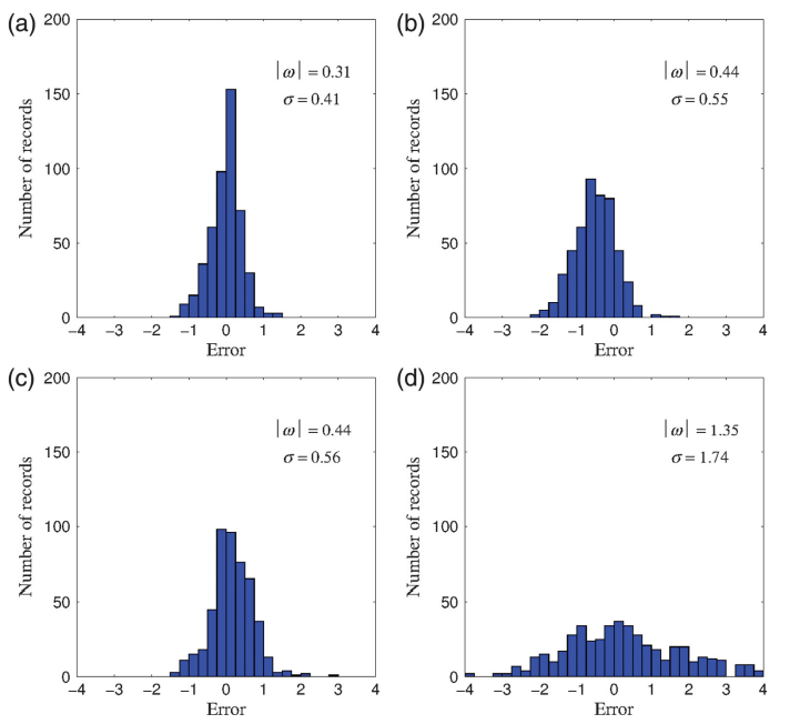 圖1 P波到達(dá)后3秒時,(a)TLSVM-M模型、(b)SVM-M模型、(c)Pd方法和(d)?c方法的震級估計誤差分布