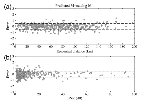圖2 P波到達(dá)后3秒,基于TLSVM-M模型的單臺震級估計誤差與(a)震中距和(b)信噪比的關(guān)系