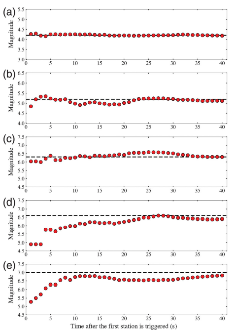 圖3 首臺觸發(fā)后,五次地震事件的震級估計隨時間的演化